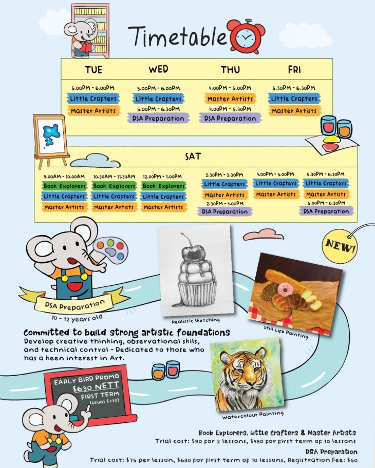 - Little Crafters - this course takes full advantage of children’s fascination of what interest them to explore and expand their artistic abilities beyond the basic level. According to their developmental stages, teachers use appropriate drawing techniques in class as children learn to combine shapes and lines to form their pictures from symbolic to representation form.